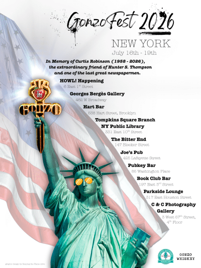 The focus of this GonzoFest is on Hunter’s political writing; the daytime events will include six panels, three to four keynote presentations, poetry readings, films and music. Also, a gallery showing of Hunter’s art. And, not to miss, a tour of Hunter’s New York City (Hunter took classes at Columbia University, wrote his Kentucky Derby piece at the Royalton Hotel, worked at Time magazine, and wrote his first (unpublished) novel in Greenwich Village).